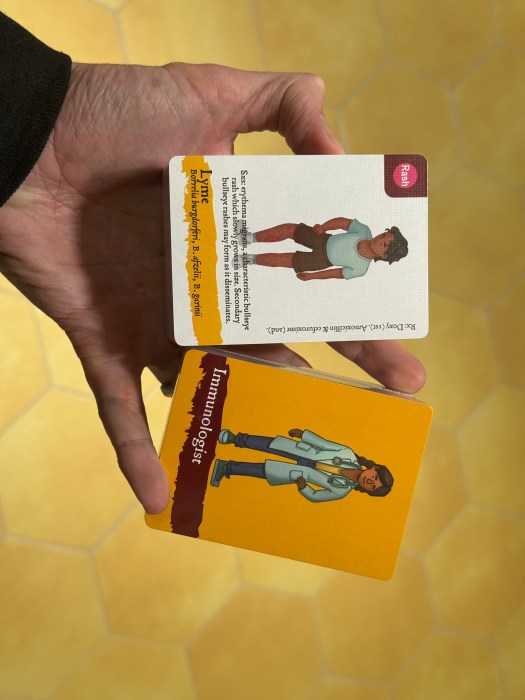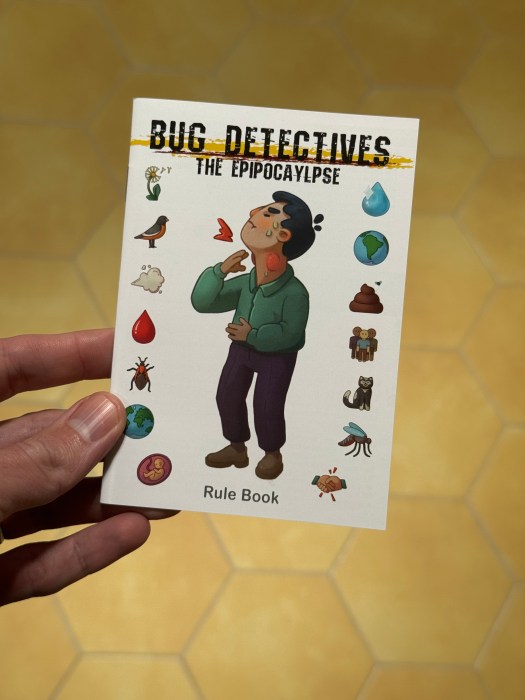 In Bug Detectives: The Epipocalypse, players strive to collect the most Infection cards correctly matched with the Scientist cards that want them within the allotted time. Infections can be matched to Scientists by the types of infections they cause, their geographic distributions, reservoirs, vectors, and more. A single Infection can be matched to multiple Scientists for rapid scoring.